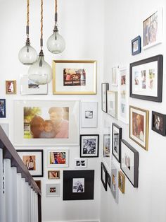 Stairway walls are often the most difficult to navigate and design. Not only are you hanging on an incline, but there's also the decision of what to hang. Family photos? Artwork? Or a combo of both? Stairways are a great place to hang some great professional photos of your family, As any mom knows, you went through a great deal of time, money and effort to get your family looking sharp for that photo shoot, so you should definitely show those photos off. But if a wall of family photos isn't your thing, then collect a combo of small, medium and large framed artwork. PRO TIP - I always measure the wall space end to end, then lay them out on the floor and fit them together like a puzzle.
